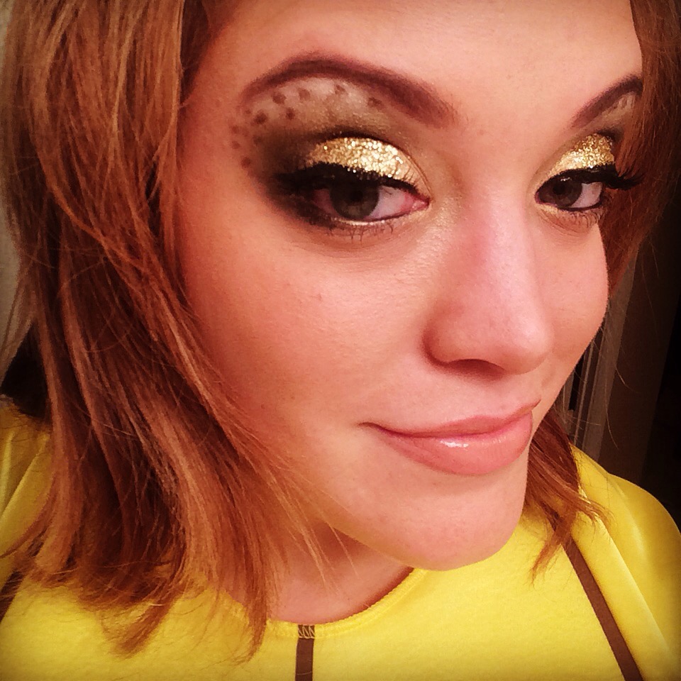 I completed the rest of my eye makeup with some cream eyeliner, mascara, and false lashes. This was not my proudest eyeliner job as I am not used to using this eyeliner and do not have the right brush to make it work on the rocky, glittery surface. I am partial to the Stila Stay All Day Liquid Liner, but did not want to destroy the felt tip by dragging it across the caked on glitter. I used some brown eye liner to draw “banana spots” on my brow.