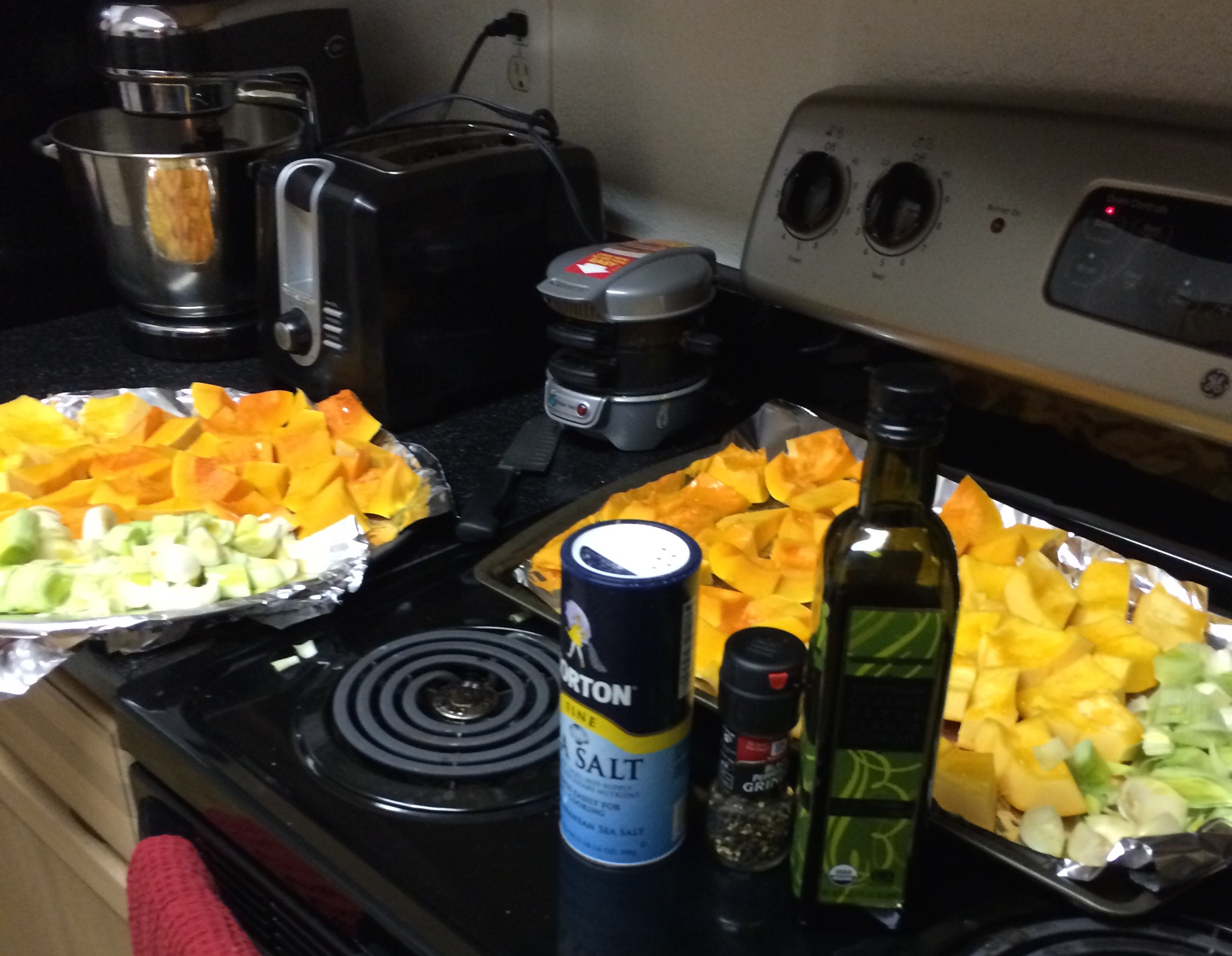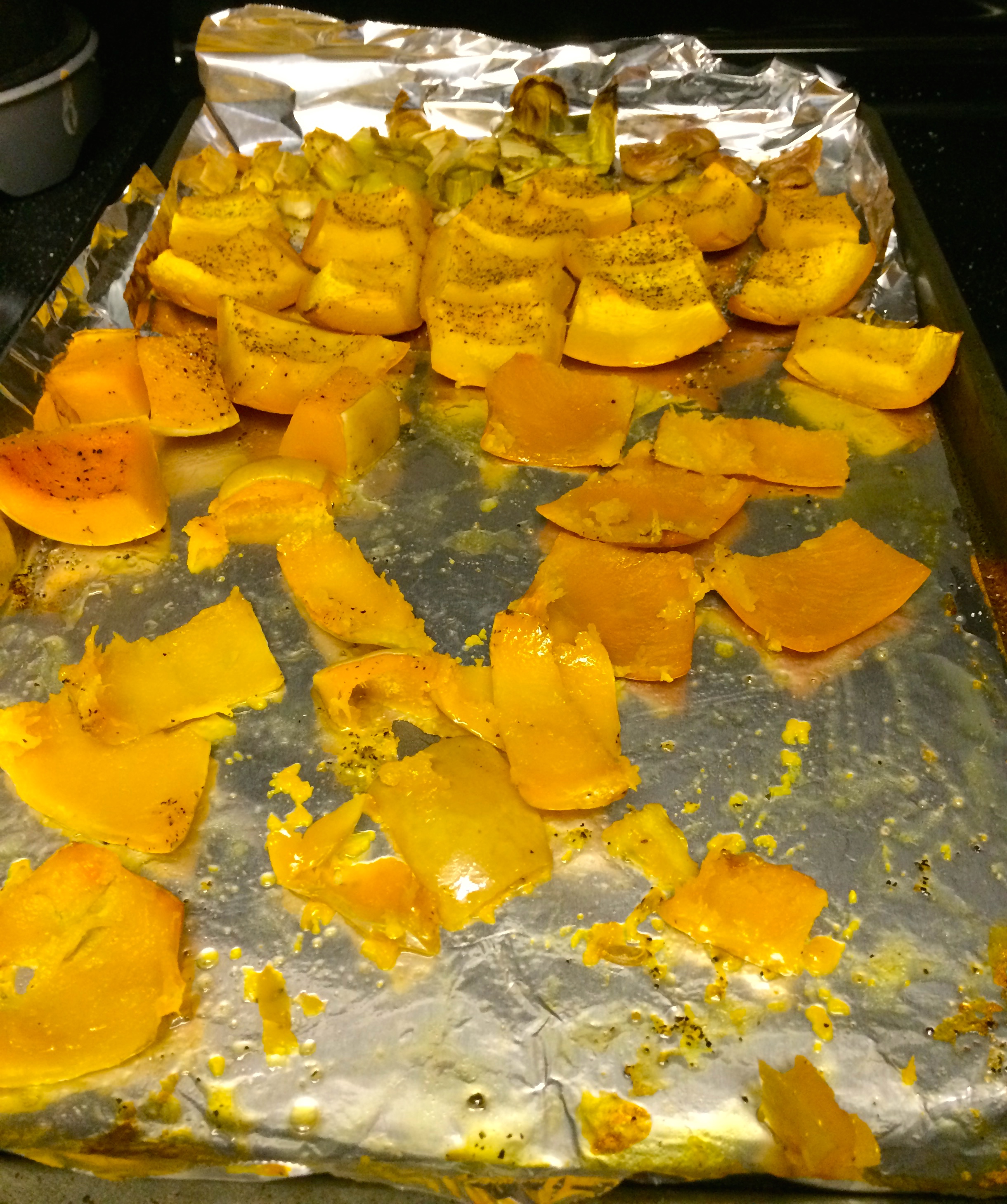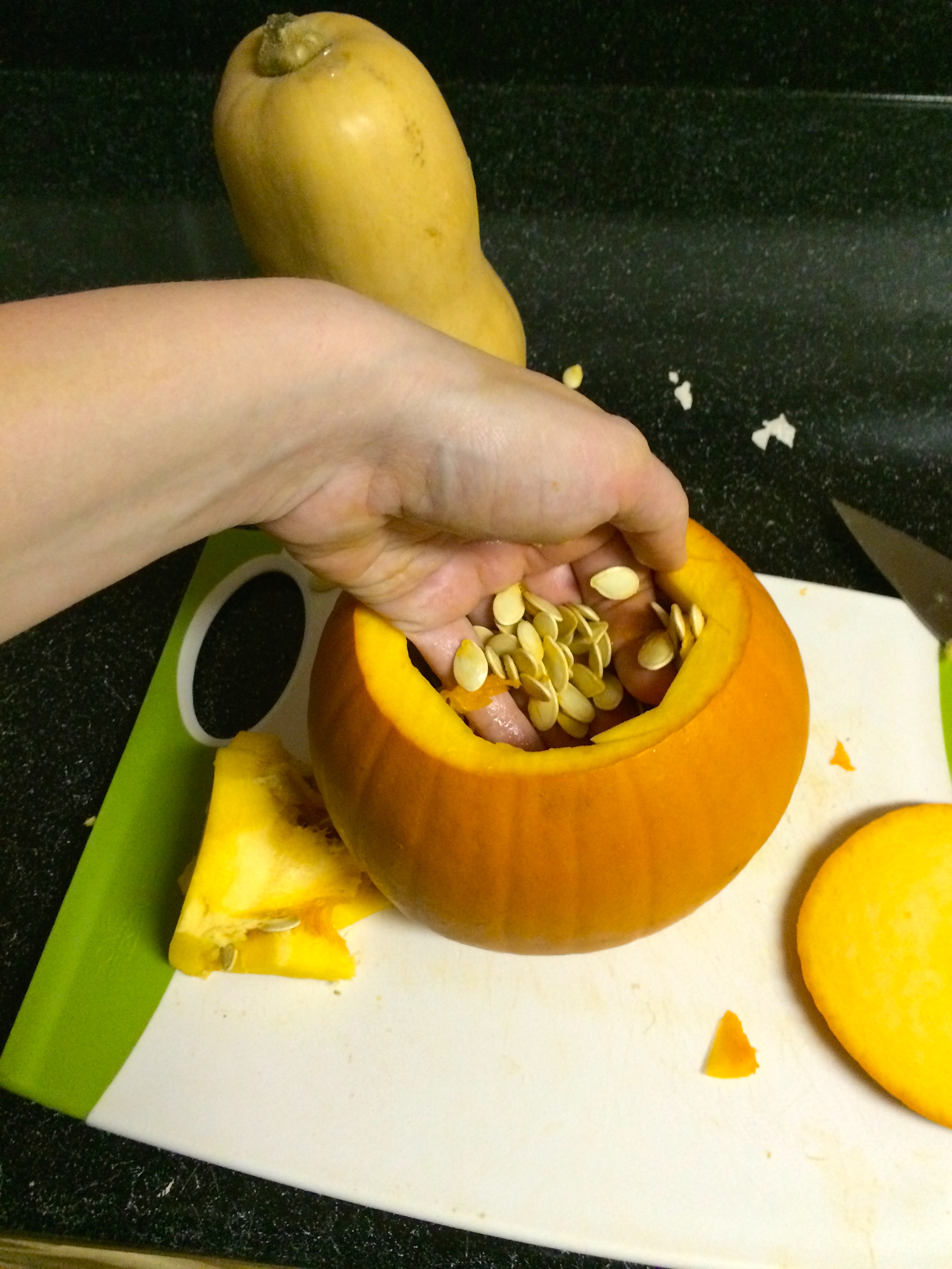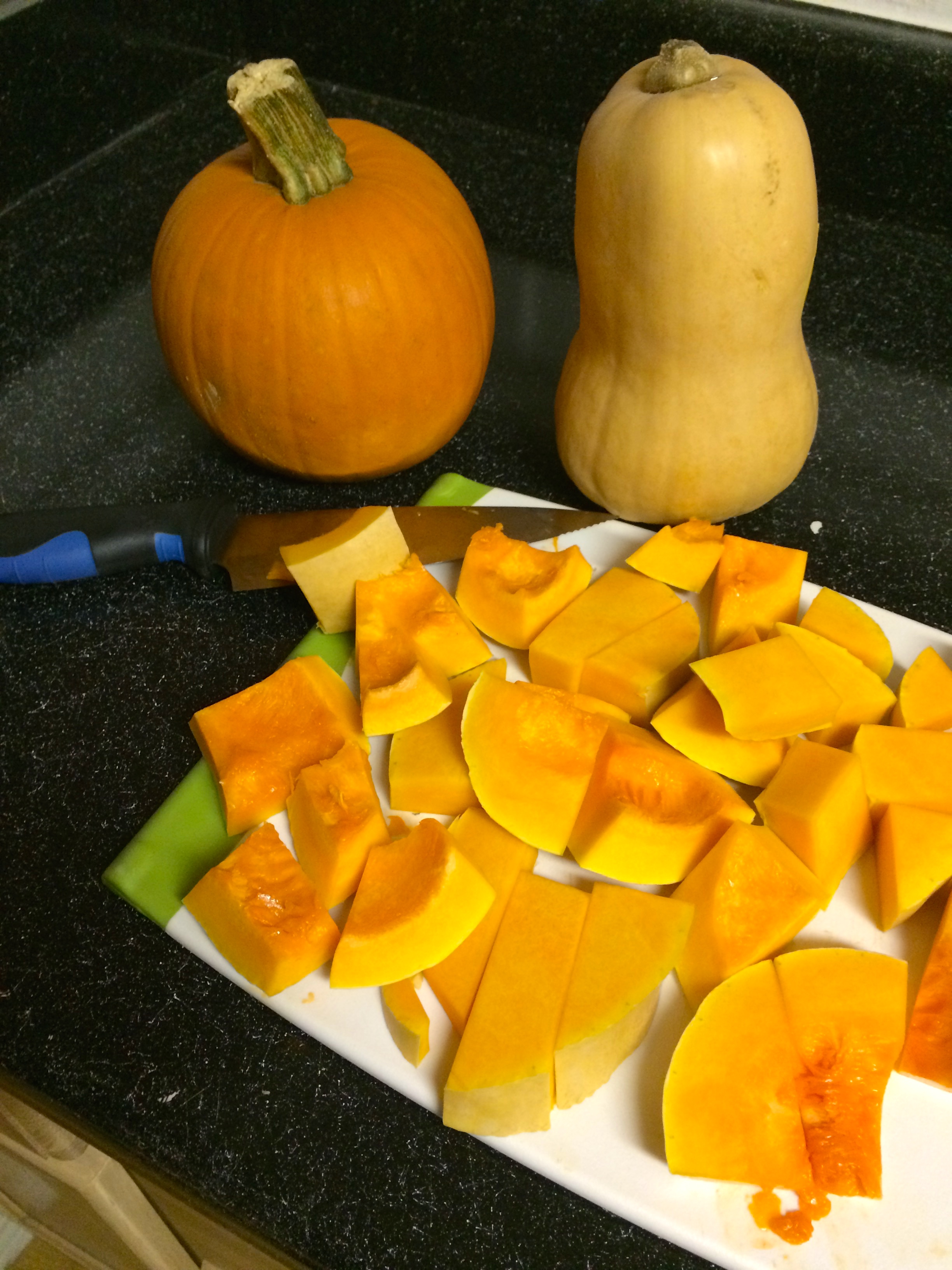 - Cut your butternut squash and pumpkins into 2 inch cubes. Remove the seeds and “fibrous bits” (lol).