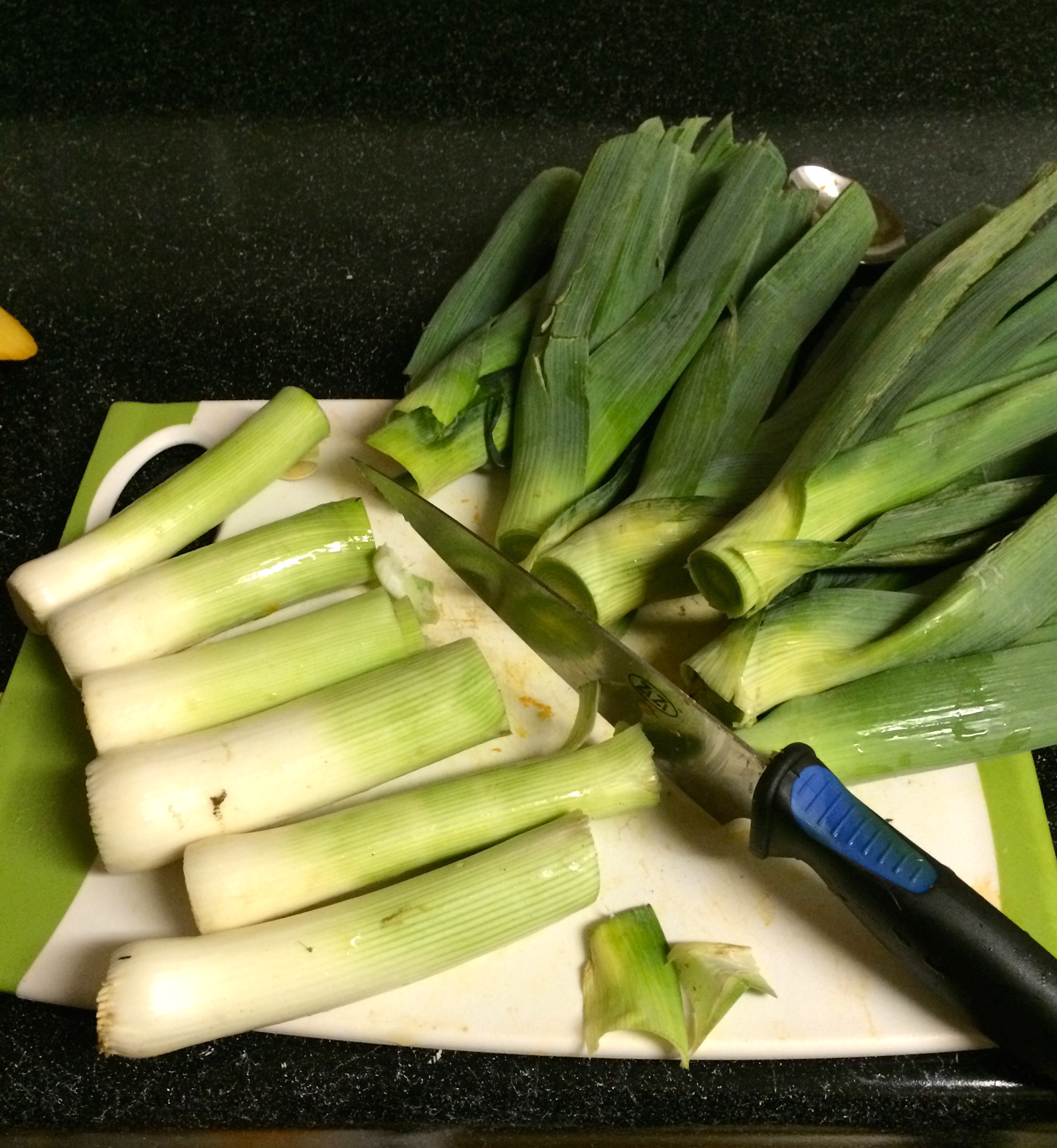 - I never actually know where the “white part” of the leeks technically start, so I chop off anything that looks to be categorized as the “leafy part” and I use what’s left.