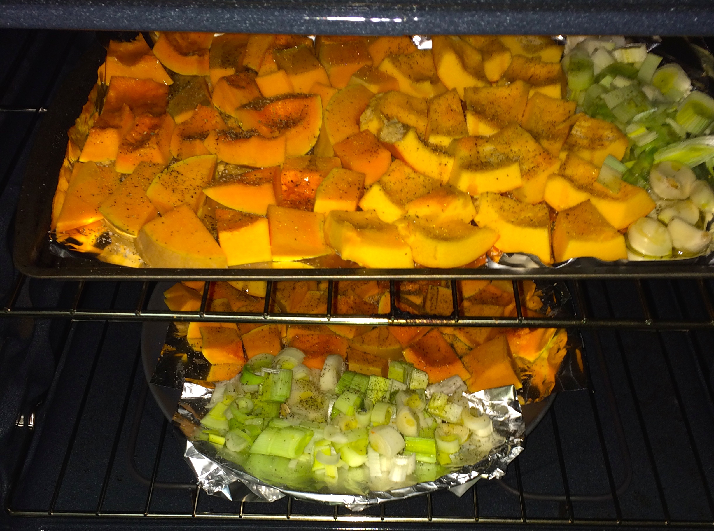 - Arrange the butternut squash, pumpkin, leeks, and garlic on a baking tray.