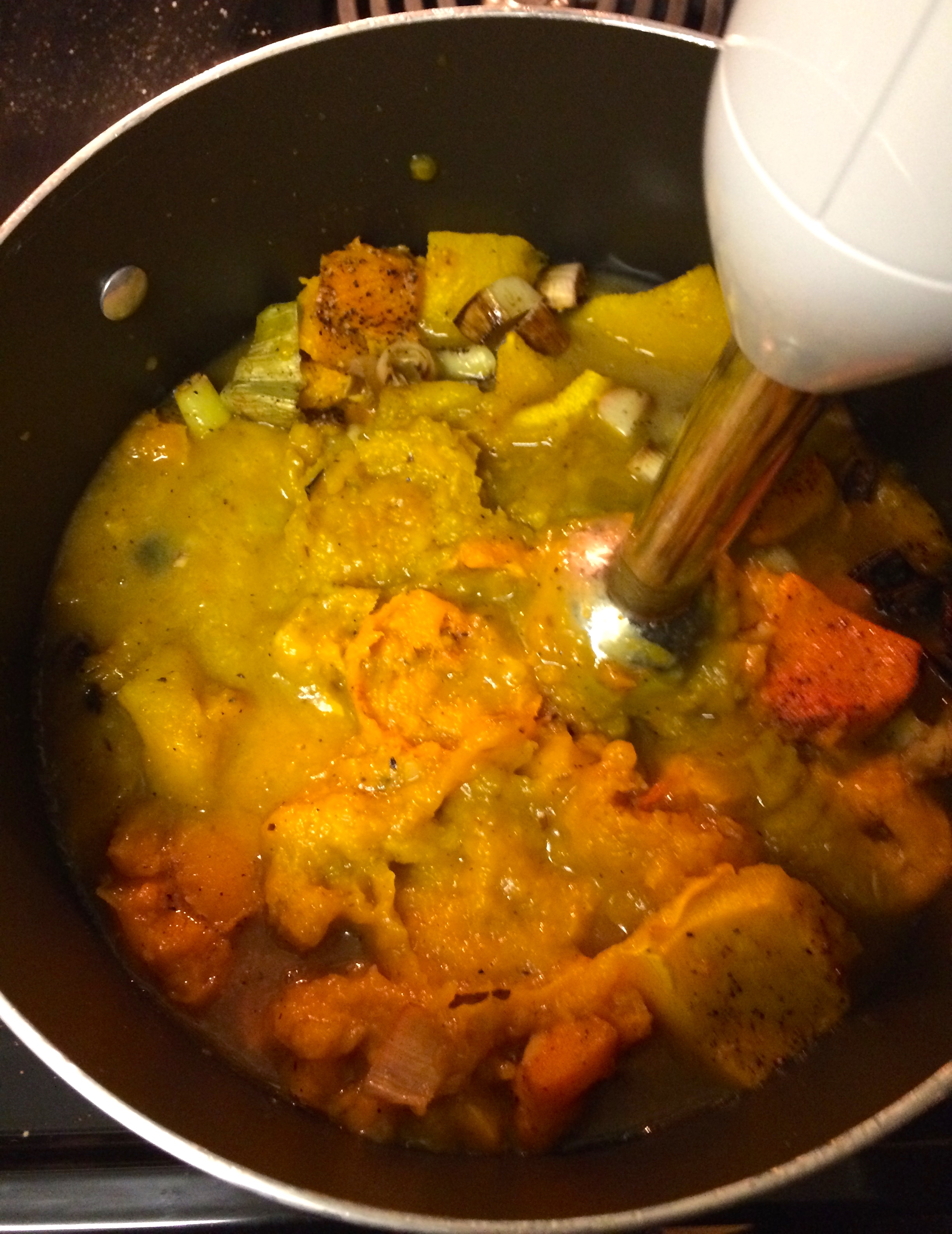 - Use an immersion blender to mix ingredients together. Keep adding broth until you reach your desired consistency.