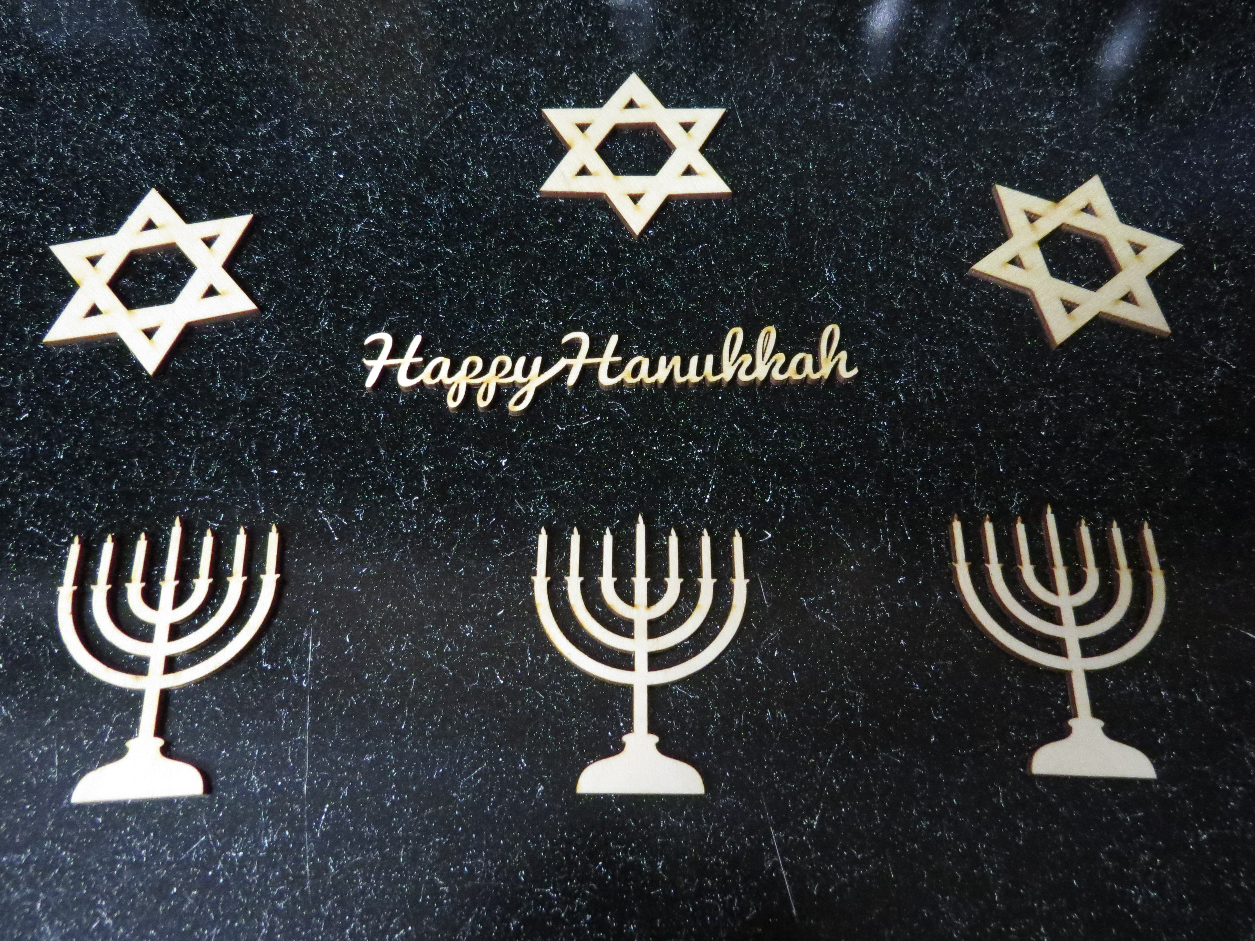 1. I purchased some wooden cutouts from Etsy. The “Happy Hanukkah” and Stars of David came from CutLineCraft and the menorahs came from a store that apparently has shut down in the past couple of weeks. Unfortunately, the “Happy Hanukkah” cutout was broken. However, based on the shipper’s packaging, it was not for lack of trying to keep it safe. I was so excited about actually finding wooden menorahs that I did not pay attention to the fact that they are short two candles. Oh well.