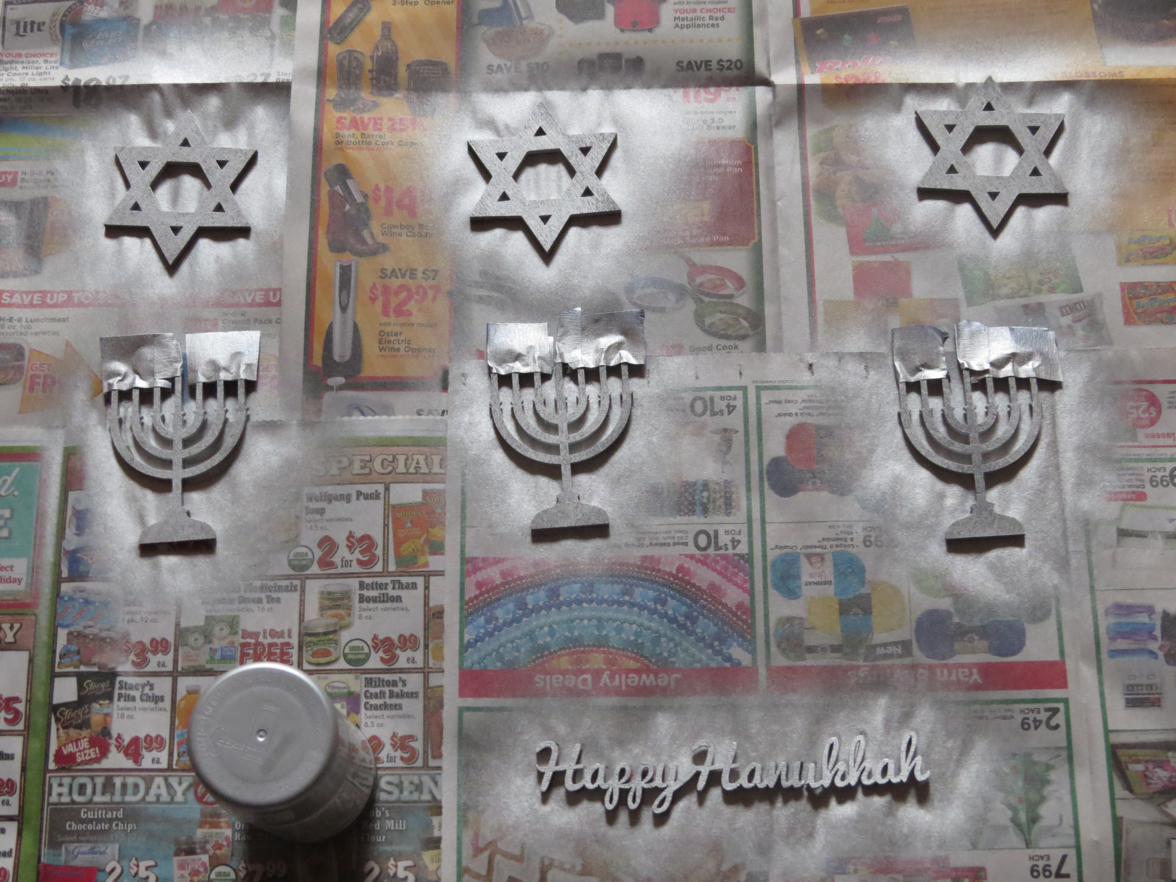2. I placed painter’s tape over the tiny candles of the menorahs to keep them golden. I sprayed each side of the cutouts with silver spray paint.