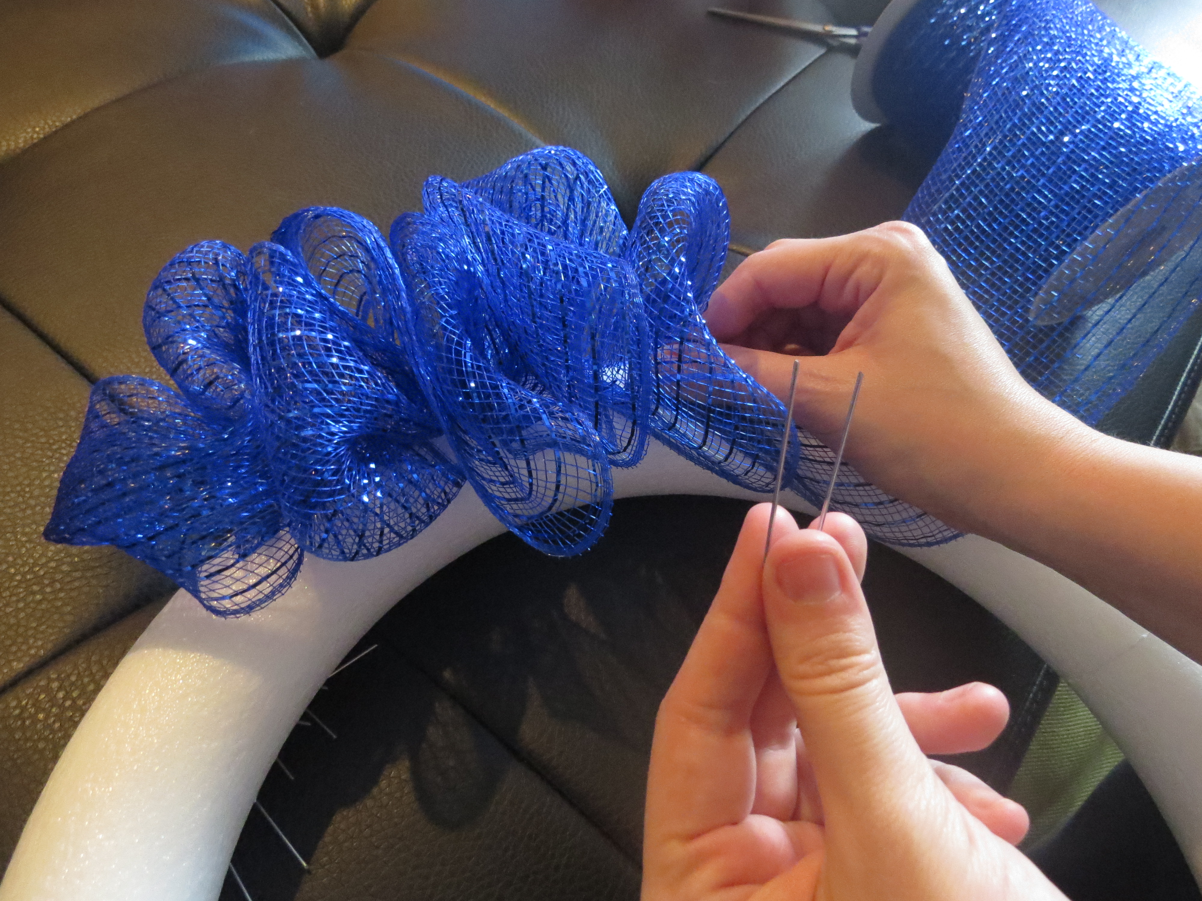 4. I started on the outer edge of the wreath by gathering the mesh and pinning it to the wreath with the floral pins. I went around the entire outer edge like this.