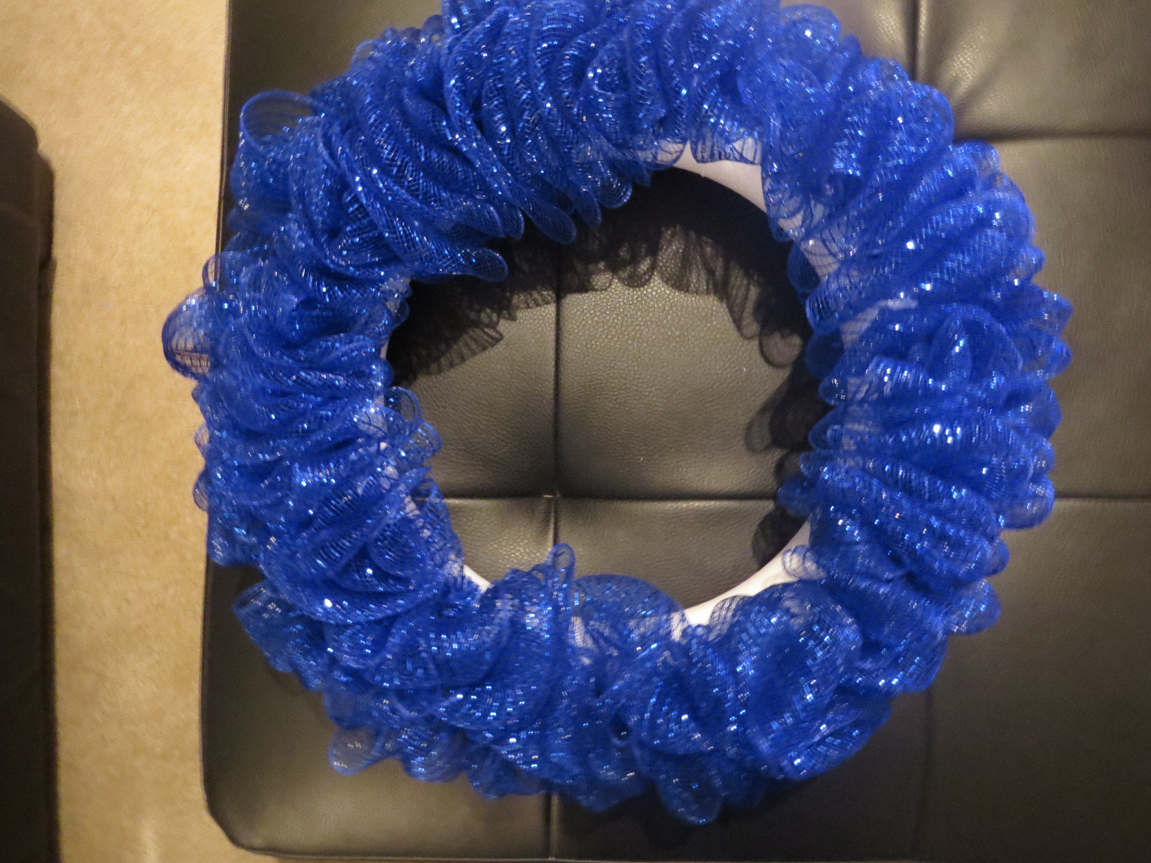 3. Next, I gathered the Styrofoam wreath, mesh, and floral pins. Unfortunately, I grabbed the wrong mesh. If you are lazy like me and do not plan on wrapping your Styrofoam in ribbon first (which you probably should), you will want a more opaque mesh than I picked out. This is why I ended up having to use two spools instead of my usual one.