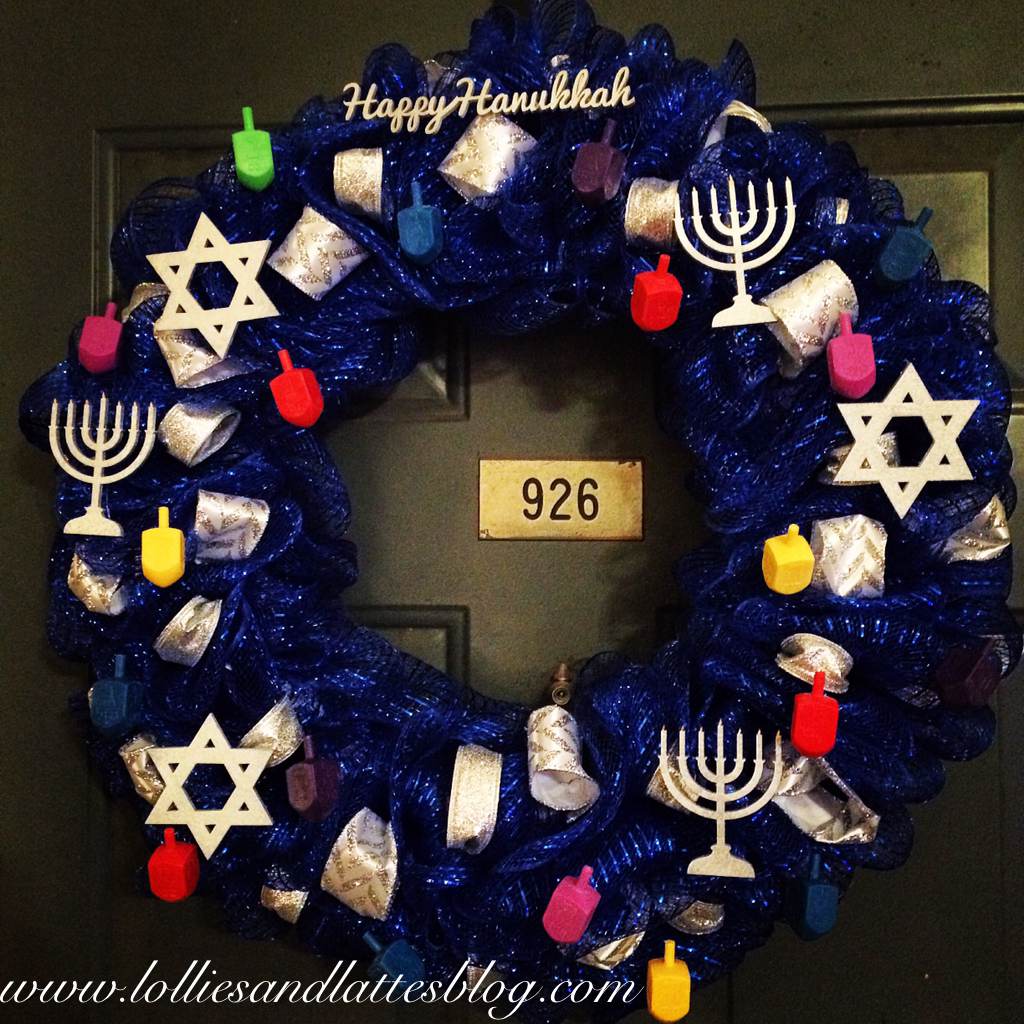 Making a mesh wreath is a breeze, really. The only part that may take time is getting everything you need together if you need to order anything online. Here in Texas, Hanukkah wreath décor can be very difficult to find. Also, I am very impatient when it comes to waiting for spray paint to dry.