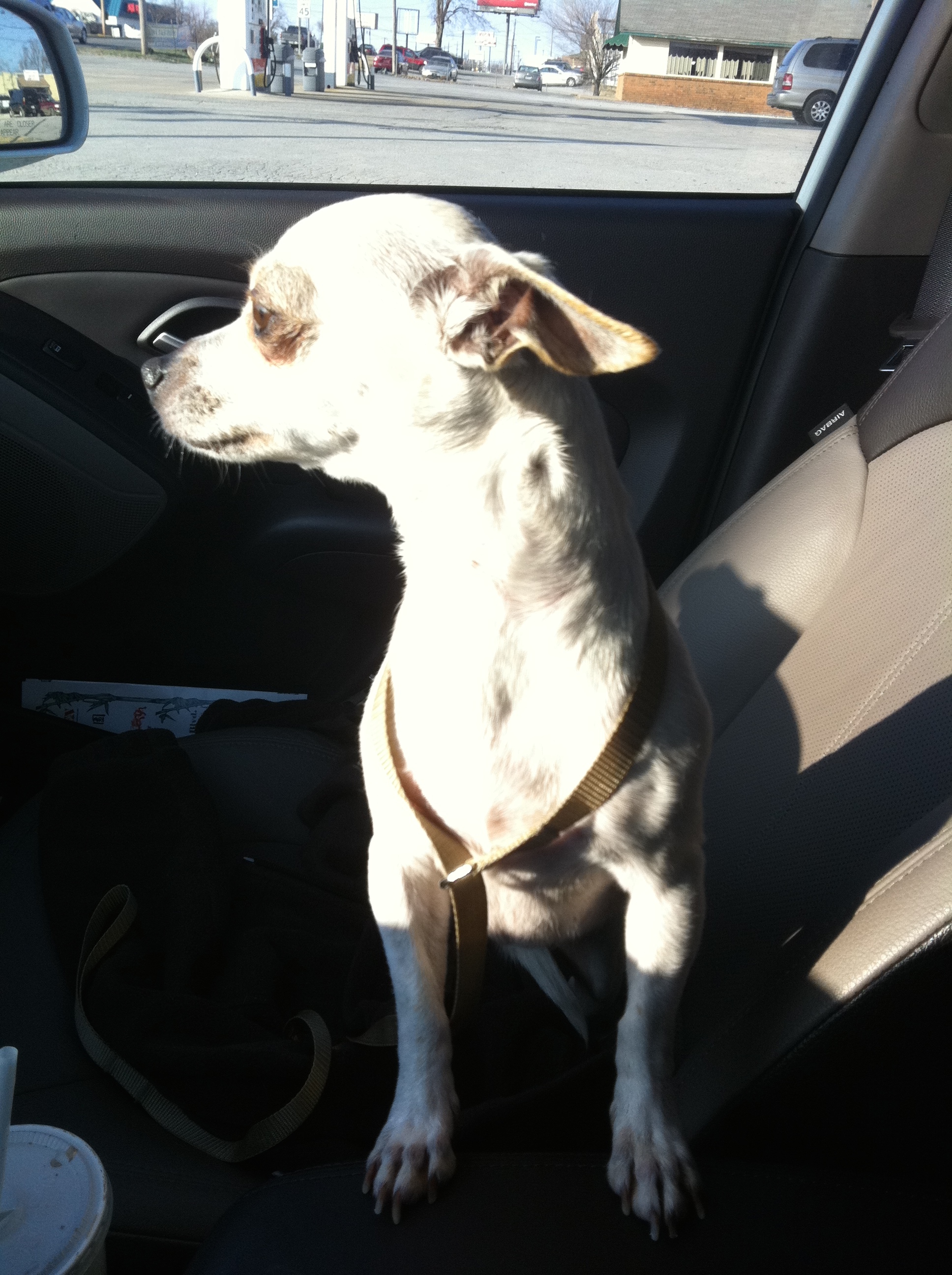She had to be mine. I called the shelter and told them that I wanted to adopt “Millie the Chihuahua” (Lollie’s former street name) instead. I was able to pick her up two days later. I took this photo once we got in the car to head to PetSmart. She looked so free and happy, but she also looked a hot mess.