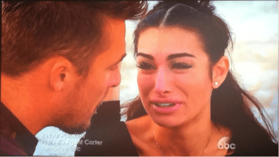I like Becca a lot. She was real, she was honest, and she didn’t define herself by her virginity (like Kardashley). As the end the show approached, I was concerned that Chris was falling for her because she was harder to crack. She wasn’t sure how quickly she wanted to get married and was concerned about what she would do when she moved to Iowa. I mean, she lives in San Diego. The decision would probably have been much easier for her if they could have just been in love on the beach and not in the corn. She also wasn’t sure if what she felt was love, which means that it wasn’t. When Chris let her go on the last day, her response was somewhat robotic. This is what Becca looks like when she’s devastated: