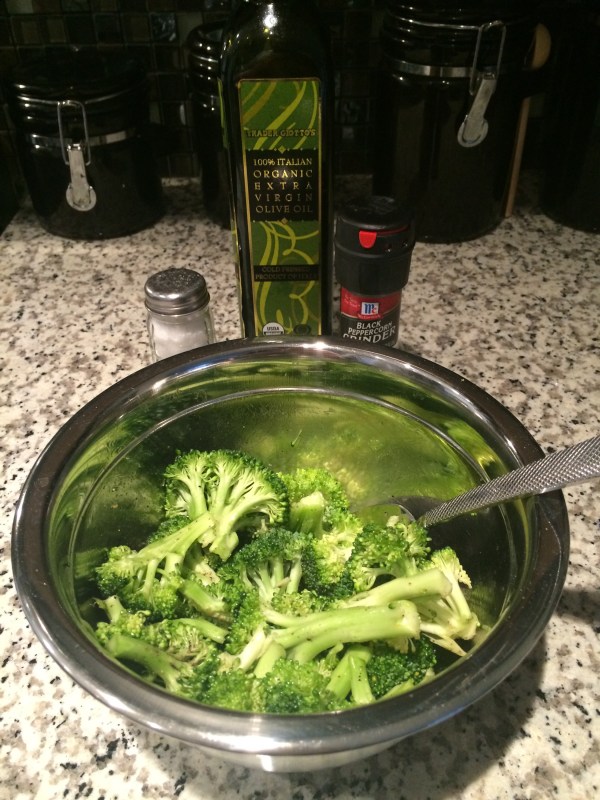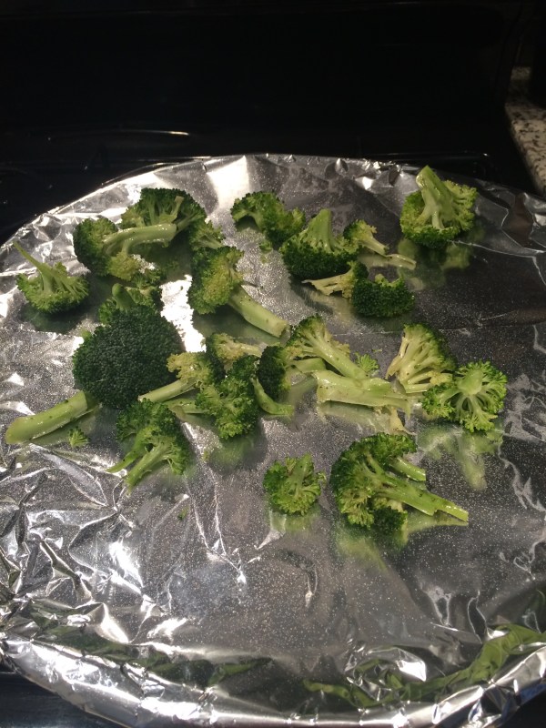 After cutting the broccoli into bite-sized pieces, I tossed it with some salt, pepper, and olive oil.