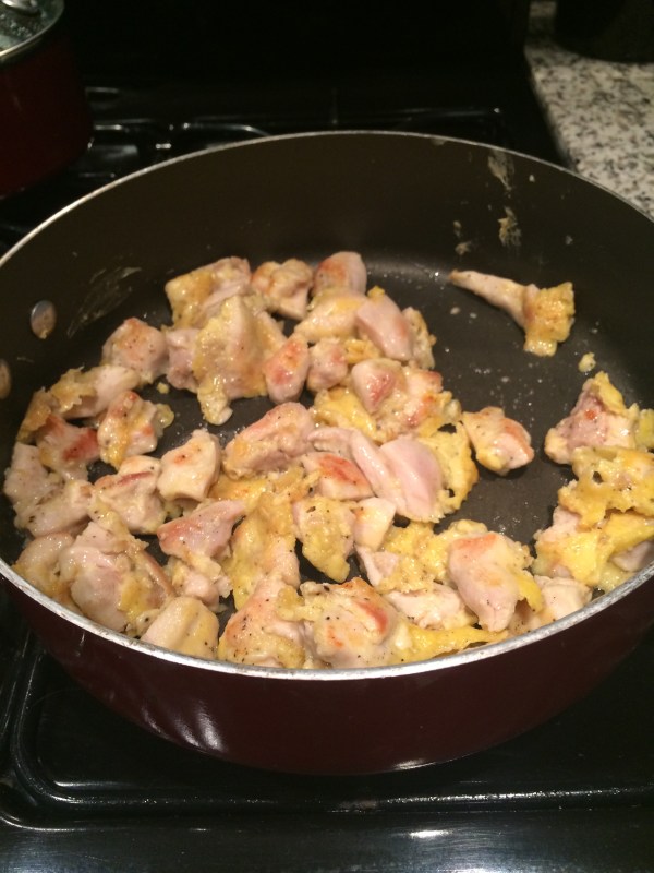 I cut up the chicken into bite-sized pieces and stirred it into the egg mixture.