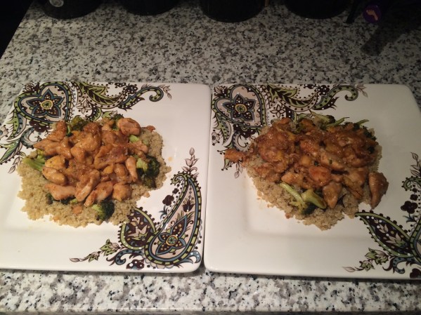 Finally, I divided the quinoa onto two plates then topped it with the roasted broccoli and chicken.