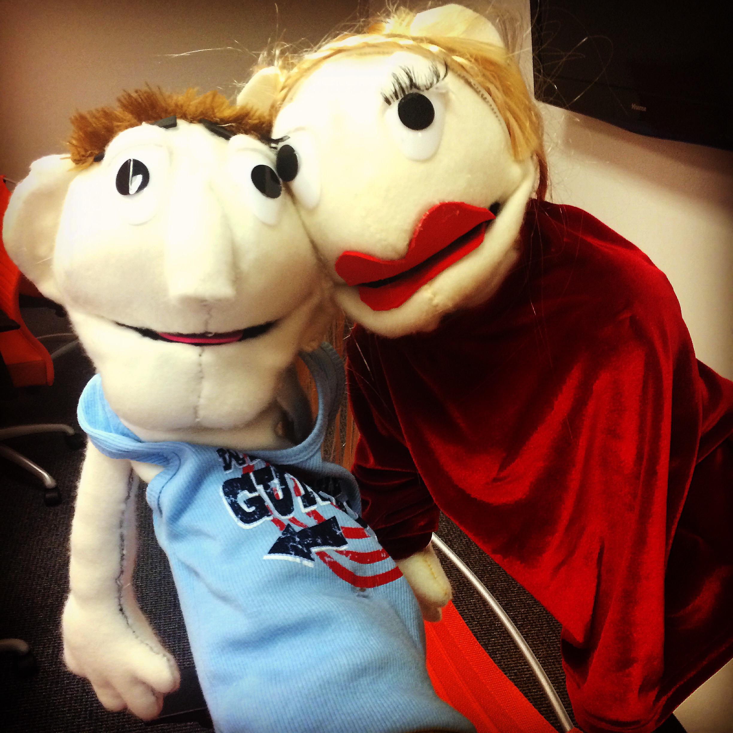 You might be asking yourself… are those puppets? Why yes, they are puppets. But not just any puppets. They are puppets modeled after my boyfriend and myself… HANDMADE by my coworker, Steve. I am not sure I know anyone with the artistic talent to sew a puppet. He actually learned to sew for this. He and my other coworker, Lissette, gave us a very special puppet show. Our puppets sang a hilarious rendition of “Summer Lovin'” to commemorate how we met. In actuality, this is not at all how we met. There was even a puppet theater set up in our conference room. Everyone laughed and enjoyed the show and ate Bundtinis while I sat there with my red face buried in my hands. It was hysterical.